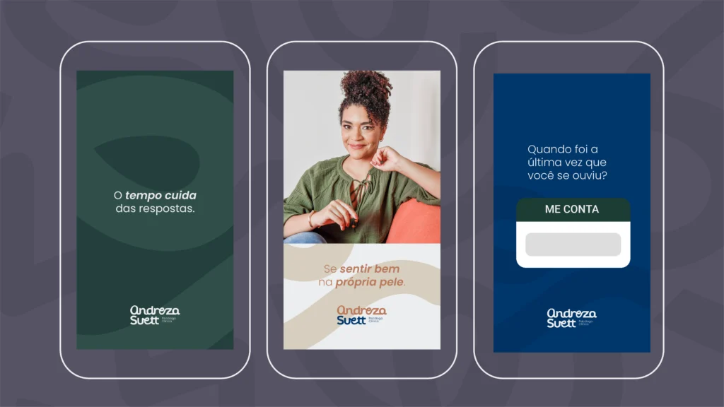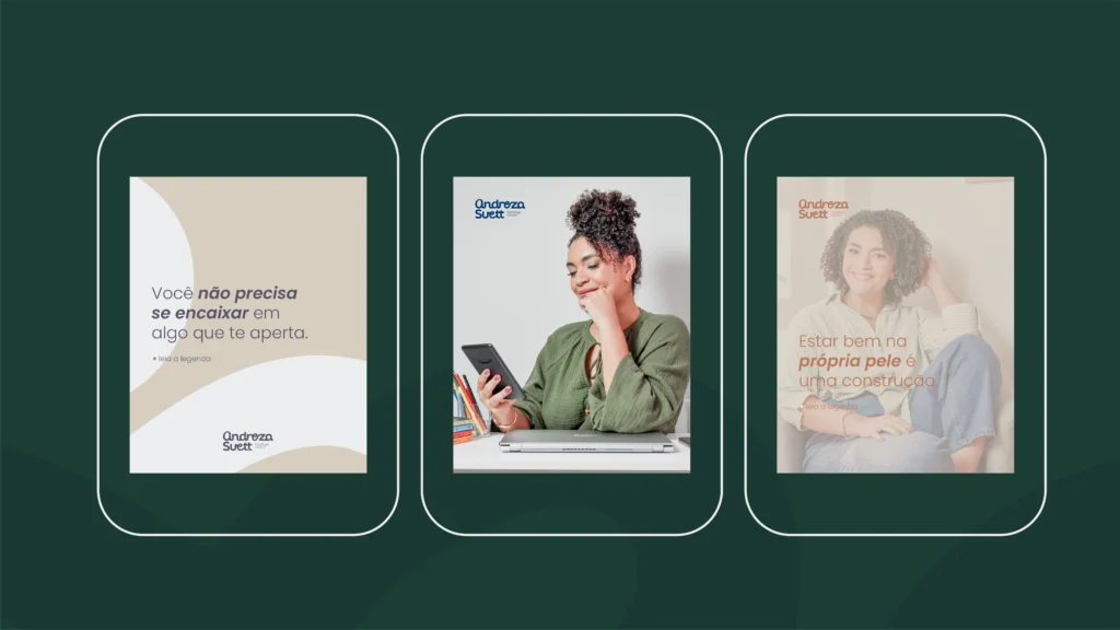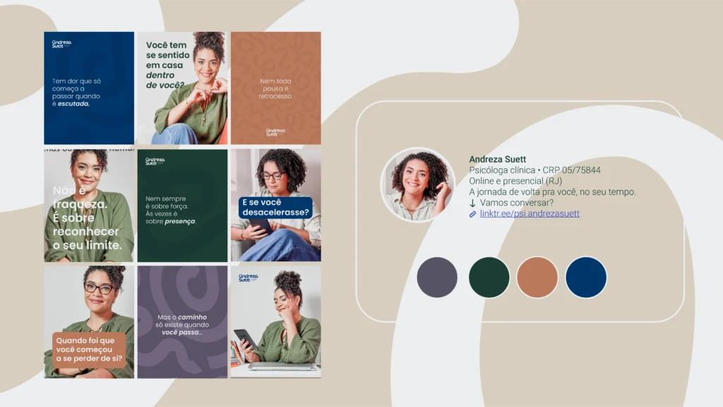O objetivo deste projeto é trazer clareza. Organizar sua mensagem, fortalecer seu posicionamento e alinhar sua identidade visual para que cada ponto de contato transmita segurança, sensibilidade e profissionalismo. Ao fazer isso, abrimos caminho para atrair o público certo e para que a Andreza se sinta confiante ao se apresentar.